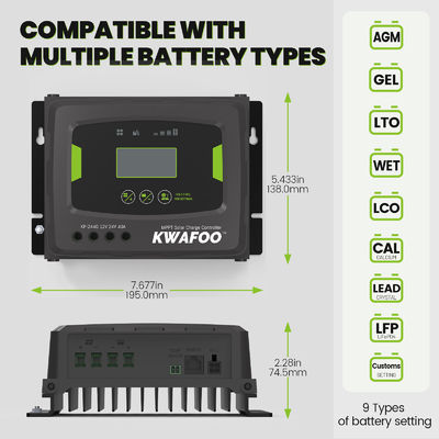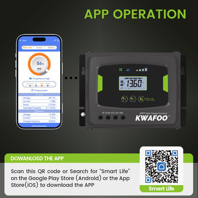 KWAFOO 40Amp MPPT 太陽光制御装置は壁掛け設計で,安装が簡単でスペースが節約できます.制御装置は,太陽系を保護するための包括的な保護メカニズムを装備しています超充電保護,短回路保護,逆極性保護を含む.